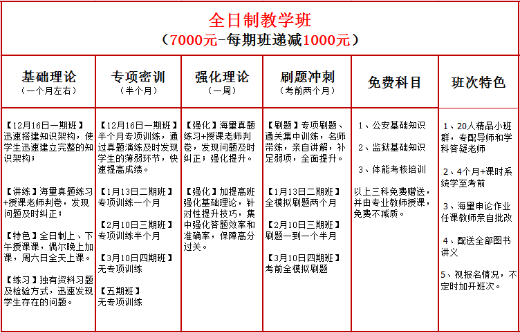 全年班(整年學(xué)習(xí)),學(xué)習(xí)3次課。所有教案,卷子,題庫都免費(fèi)發(fā)放。大概1000元的資料大放送,公安基礎(chǔ)監(jiān)獄基礎(chǔ)免費(fèi)!
